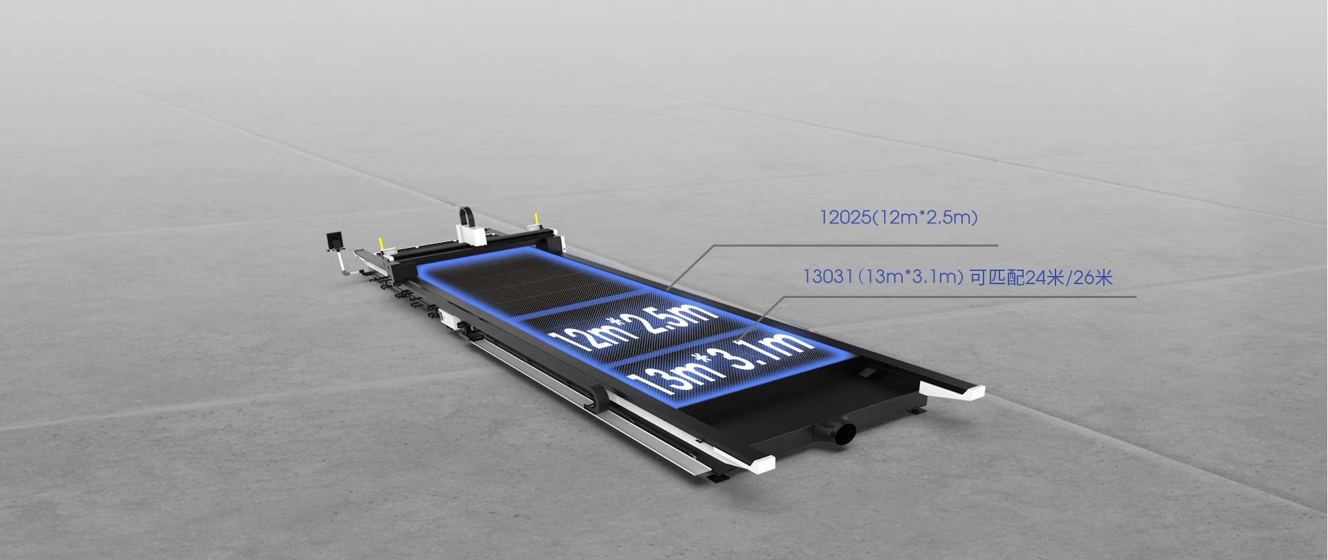 | 26200*3200mm 加工幅面 | 24200*3200mm 加工幅面 | 13100*3200mm 加工幅面 | 12200mm*2600mm 加工幅面 | 8000mm*2500mm 加工幅面 |